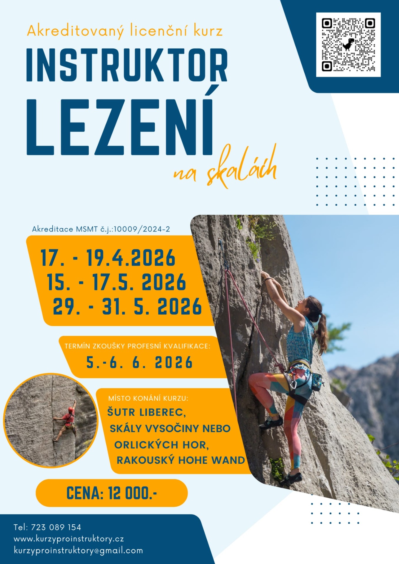 Místo: lezecká stěna Šutr Liberec, cvičné skály v Orlických horách nebo na Vysočině, pískovcové skály Českého ráje, rakouský Hohe Wand